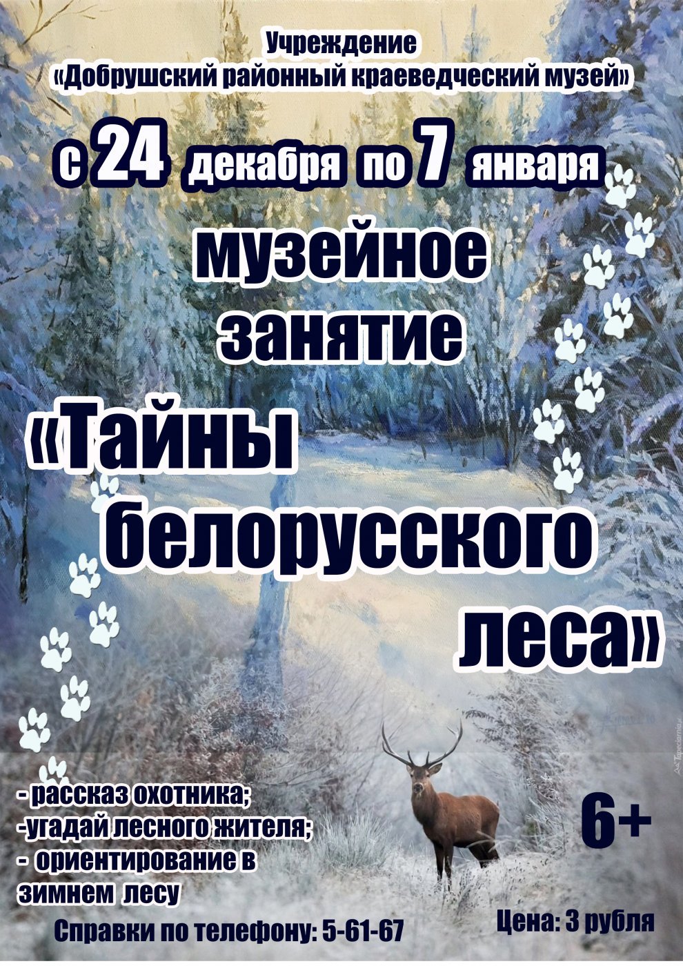 Учреждение "Добрушский районный краеведческий музей" приглашает всех на музейное занятие "Тайны белорусского леса", которое будет проходить с 24 декабря 2024 года до 7 января 2025 года. Стоимость - 3 рубля с каждого человека.